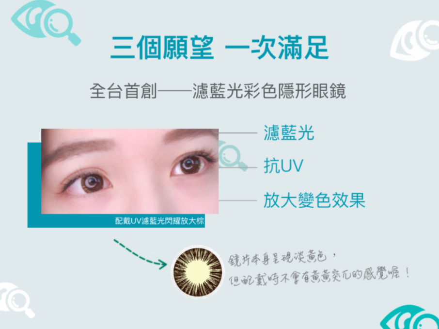 - 具備抗UV濾藍光效能,讓眼睛多一層保障。 ( 可以吸收紫外線隱形眼鏡,並不可全以替代其他必備的紫外線眼部護具,例如護目鏡或太陽眼鏡因為隱形眼鏡無法完全遮蓋眼睛 )。
