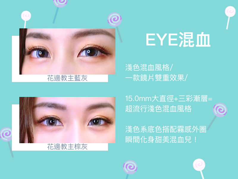 淺色混血風格,一款鏡片雙重效果時下流行淺色混血風,淺色系底色搭配霧感外圈,變身迷濛混血風格。EYE自然-玫瑰之心 / 電眼光芒棕EYE搭配-時尚霧灰 / 經典摩卡