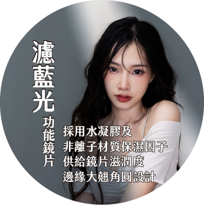 - 具備抗UV濾藍光效能,讓眼睛多一層保障。 ( 可以吸收紫外線隱形眼鏡,並不可全以替代其他必備的紫外線眼部護具,例如護目鏡或太陽眼鏡因為隱形眼鏡無法完全遮蓋眼睛 )。